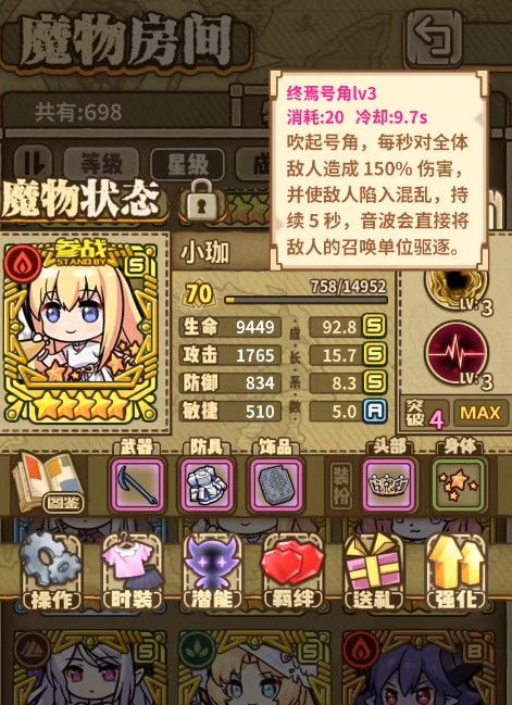 小珈:她是十分罕见的三S属性角色,即使对比同品质的其他五星魔物,属性的优势也非常明显,技能终焉号角可以对全体敌人造成150%伤害并令其陷入五秒的混乱,这招的伤害一般,但控制很足,并且施放后还能直接将敌人的召唤物给驱逐出场!