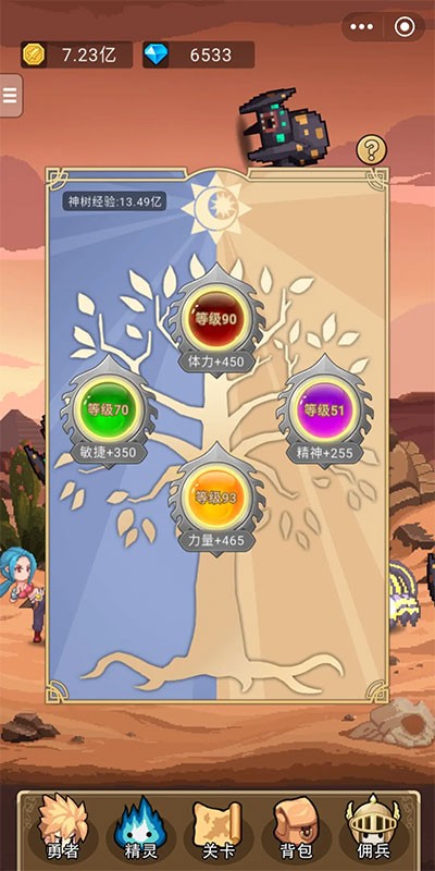 当你开启神树后,恭喜你,你的苦日子来临了,你会发现这玩意是个无底洞,压根填不满,所以前期需要针对性的去升级神树(也就是大家说的砍树),一般建议力、体互点,其次是敏、最后才是精神,我一般是4:4:1:1,后期可以多点一下体、敏。(有专门统计过的Excel表,但是太长了就不放出来了)