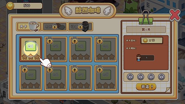 4、点击关卡1,开始开店