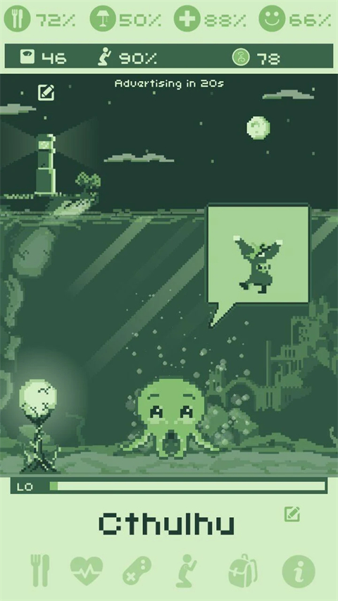 克苏鲁虚拟宠物是由NeuroCreativa开发的一款采用了复古的绿色像素风格制作的电子宠物养成类游戏。“克苏鲁虚拟宠物”这款游戏以西方远古邪神为背景,在游戏中玩家将饲养益智可爱的小型章鱼。与其他宠物一样玩家需要和他对话陪他玩耍、喂食、清洁等,满足他提出的需求陪伴他快乐的成长。