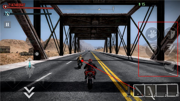 5、接下来是加速和倒车按钮,同样在游戏的左下角,玩家在游戏中够可以随时控制摩托车进行加速或者倒车。
