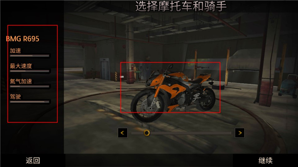 15、接下来正式进入游戏,玩家需要选择摩托车和骑手进入游戏,右边可以看到摩托车的各种性能。