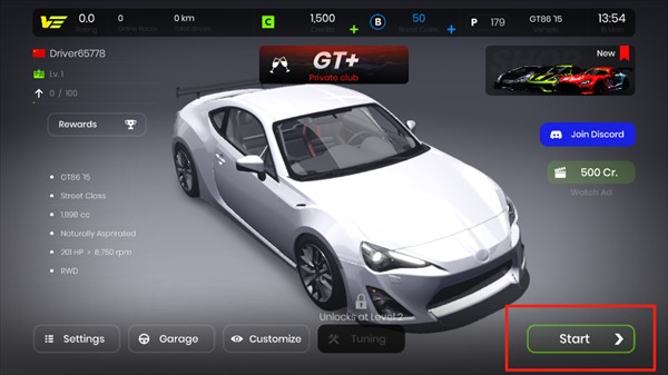 1、打开极速狂飙手游,选好车辆后点击【Start】开始