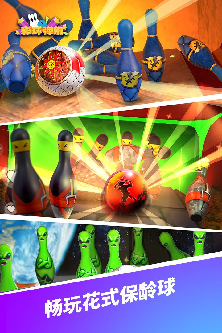 2、提升保龄球 “旋转效能”“力度”’轨迹‘ 等属性,升级并解锁个性装备,从酷炫球袋到定制手套,打造独一无二的保龄巨星。