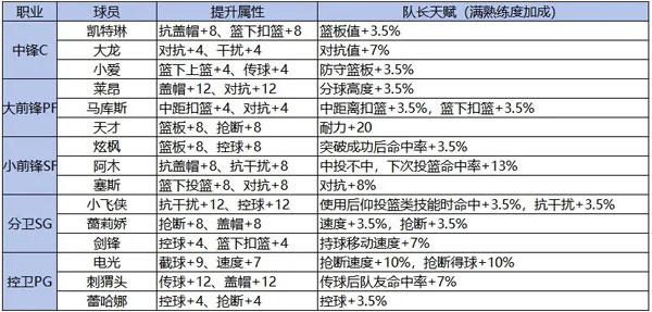 每个职业对应的职业殿堂可以放置五个球员,分为队长位置和球员位置,每放置一个球员,这个职业所有球员在比赛中都可以获得一定的属性加成。例如在球员位置放置“马库斯”,所有的PF将获得总计属性加成“中距扣篮+1、对抗+1”,以此类推放入其他同职业球员可增加不同的属性加成。