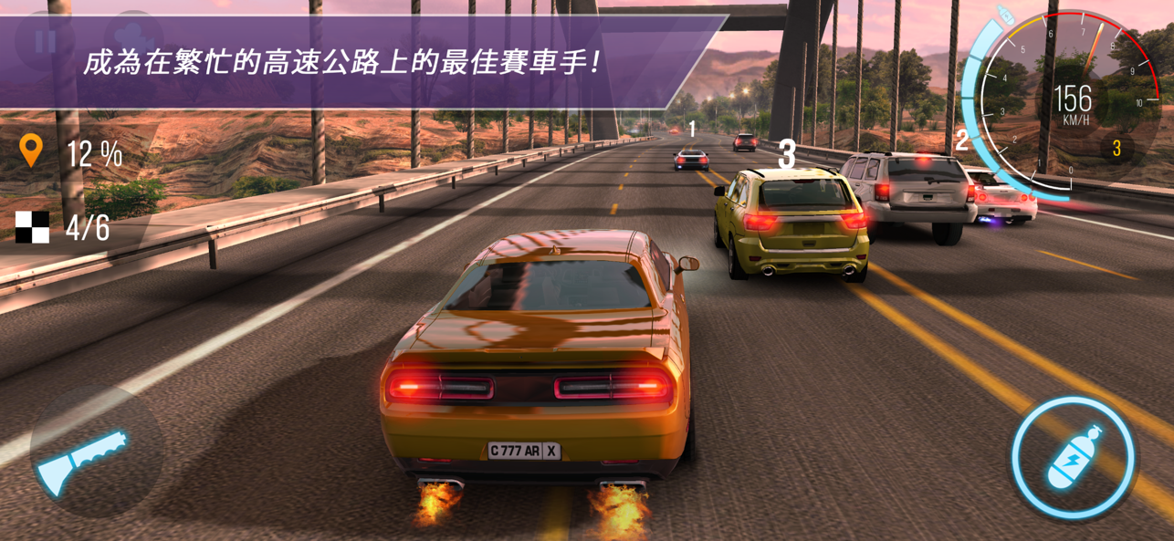 2、你将驾驶自己的赛车在城市中奔驰,点击氮气喷射按键可以加速;