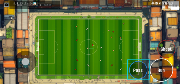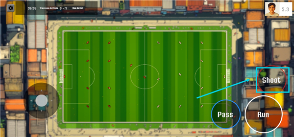 1、进入比赛后,由你开始发球,操控左边遥杆控制方向,点击【shoot】将球踢出。