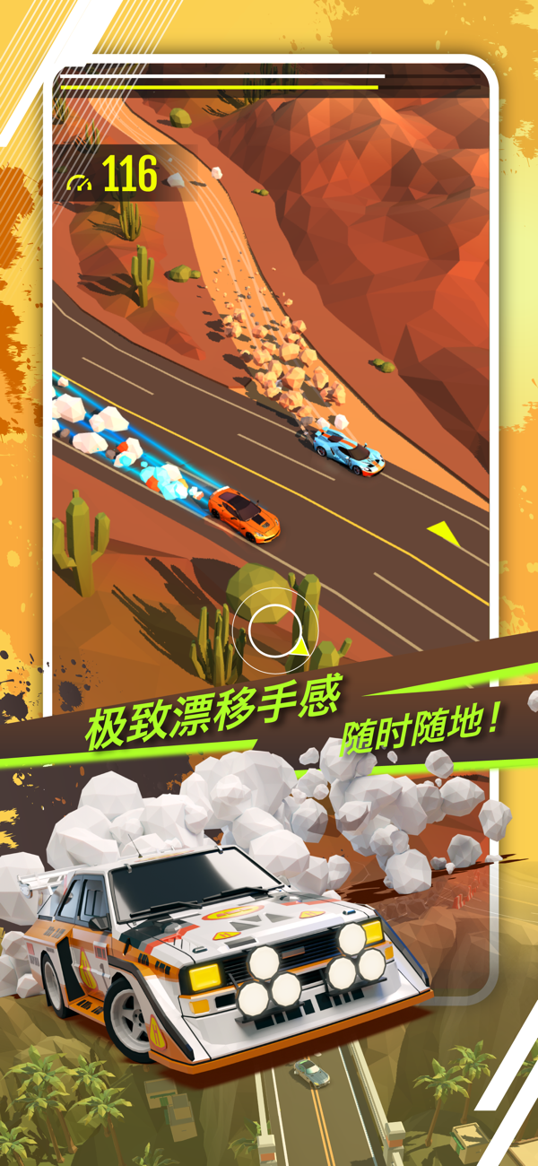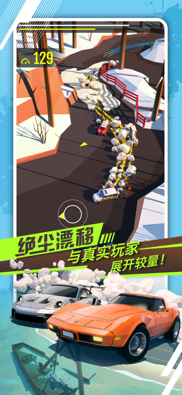 1、趣味的漂移机制,只要漂移就会留下大量的尘土,真人实时对战,来一个漂亮的甩尾吧!