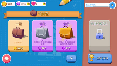 当你累计到10-20个公文包的时候,你就点击抽取公文包里面的物品,这样你就会得到相应的金币,爱心,图纸,以及少量的钻石(钻石没一点用,个人体悟,可能我还没有玩到最后)。