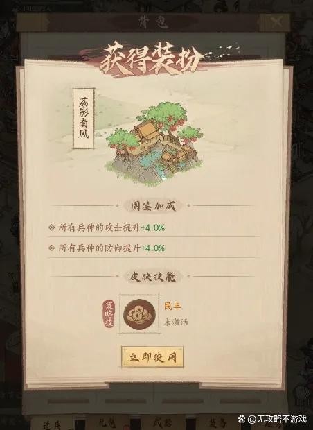 拥有这款皮肤,即可前往书阁,激活图鉴属性,所有兵种的攻击、防御属性都将大幅提高,九州战斗将更加强大。适合经常在九州征战的玩家获取!