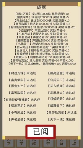 影响力:每200声望提升1点影响力,100为上限,至上限可架空皇帝及改朝换代。