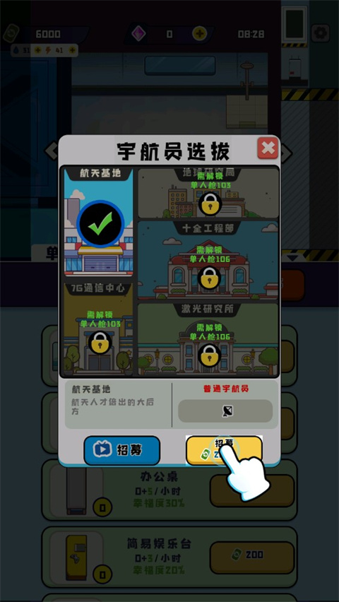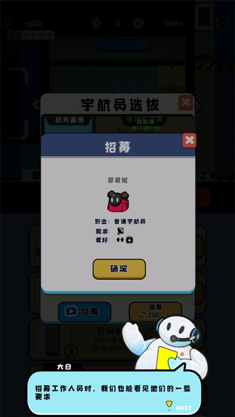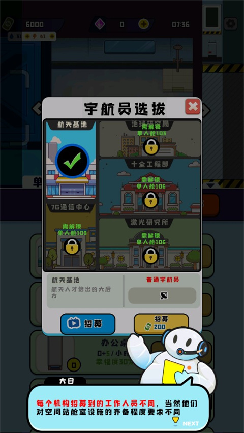 2、整个空间站需要通过各种工作实验产生收益,但也需要您继续扩建才能将收益最大化。有工作成员就会有收益,先来招聘一位工作成员吧!