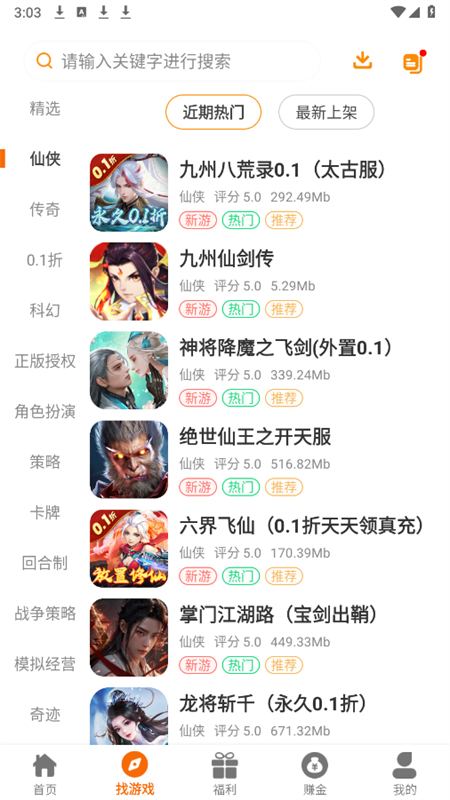 2、找游戏板块将游戏进行了详细的归类,仙侠、射击以及三国等等。