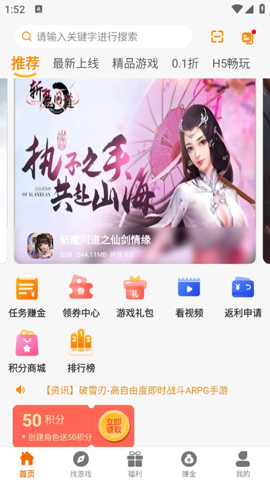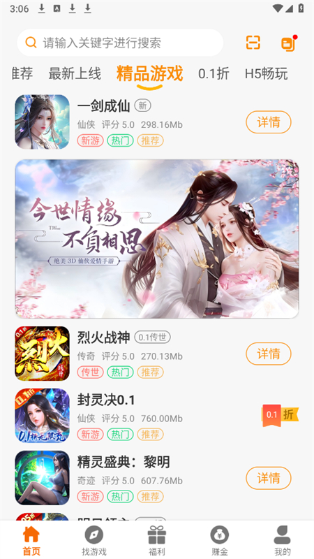 1、首页页面主要是提供当下热门爆款游戏资源,最新上线、精品游戏以及H5畅玩等。
