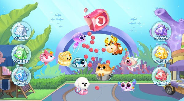 给萌鱼喂食十分简便,挑选适合的鱼食,点击后即可为鱼群喂食。