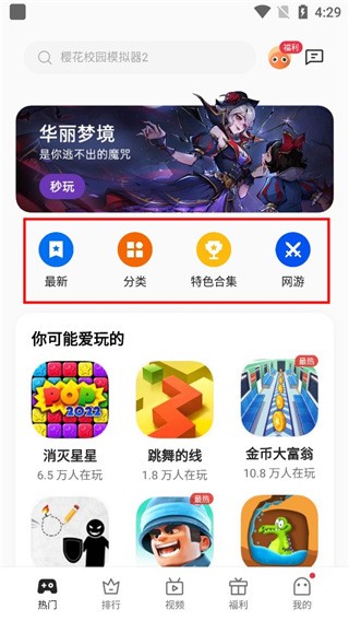 首页是热门游戏,有四个板块功能,最新、分类、特色合集和网游;