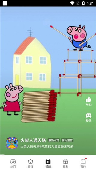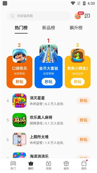 1、首先用户在本站下载并打开软件之后,可以在分类、热门、排行榜页面里选择一个自己想玩的小游戏。