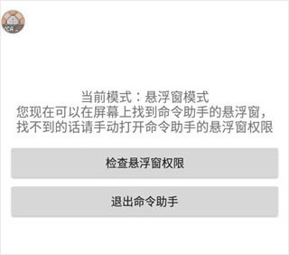 1、想要开启命令助手里的悬浮窗,那么你可以直接点击命令助手应用,在里面可以显示当前的模式,然后检查悬浮窗权限。