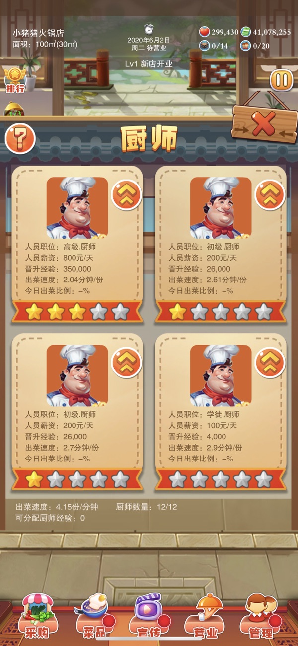 厨师升级要平均,不要把所有经验都升级一个厨师,因为厨师只能生产低于自己星级的菜,如果菜品升级,会造成出菜速度极慢。前期厨师数量最好达到在点餐客人数量等于接待客人数量为优。