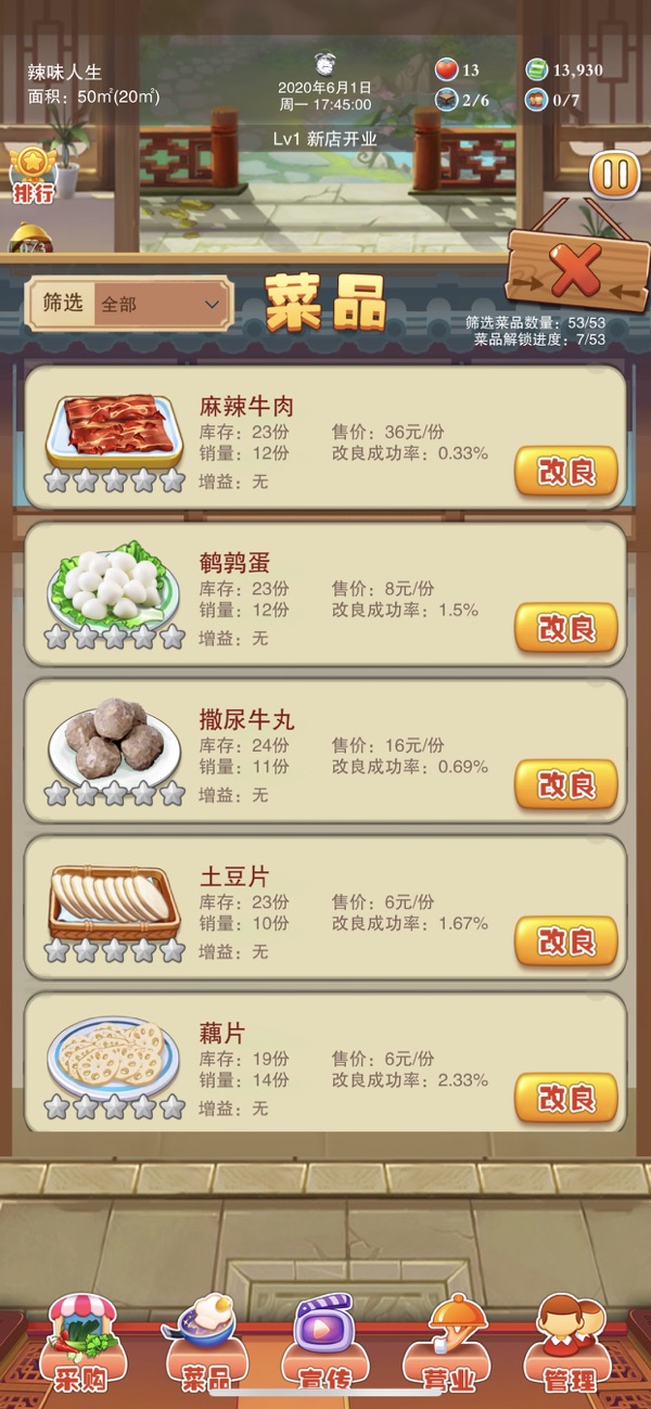 菜品:前期不要盲目解锁太多,四级到五级的要求是解锁全部菜品,此时需要大量的金钱和人气。升级最好在成功率90%以上。尤其是星级提升后,升级慢且难,当然,搏一搏,单车变摩托。