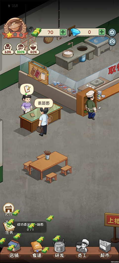 1、玩家可以建造各种设施,不断的完善自己的餐厅。