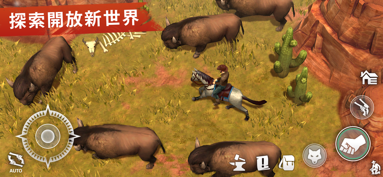 3、水牛牧场:一大群水牛,可以定期过来收割牛肉和兽皮,因此普通地图可以不必收割生肉和兽皮换做搜集其他资源。猎杀水牛时,建议在牛群外单独猎杀,否则容易被水牛群殴。可以直接去黄标水牛牧场,虽然狼不少但难度易。